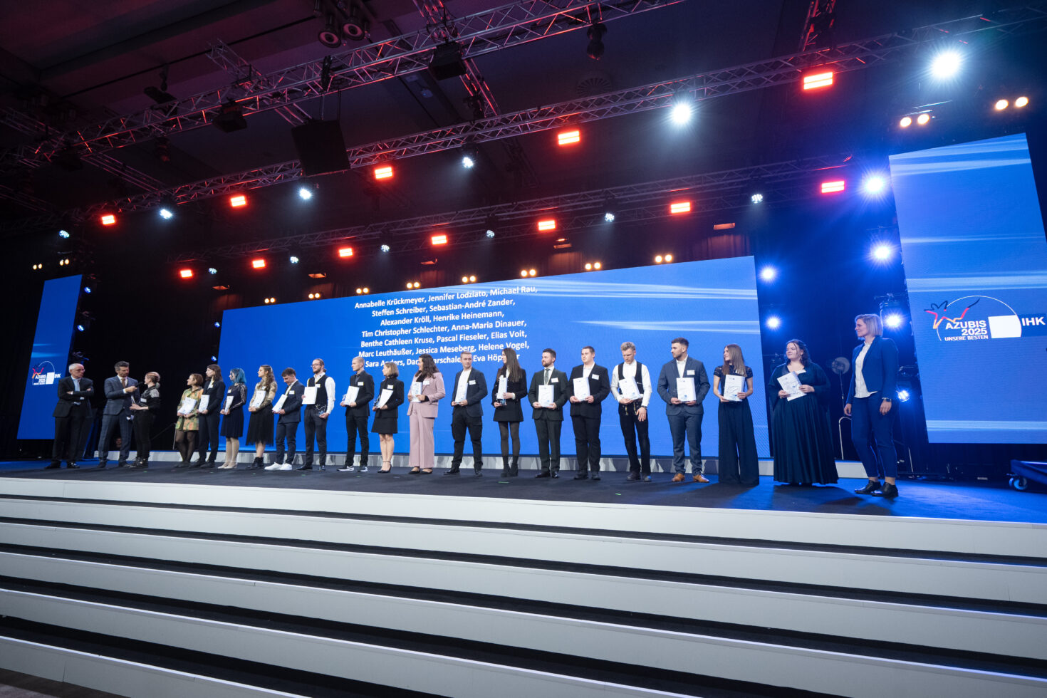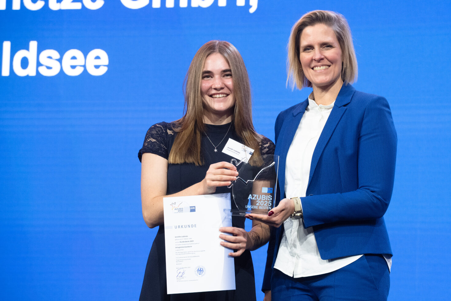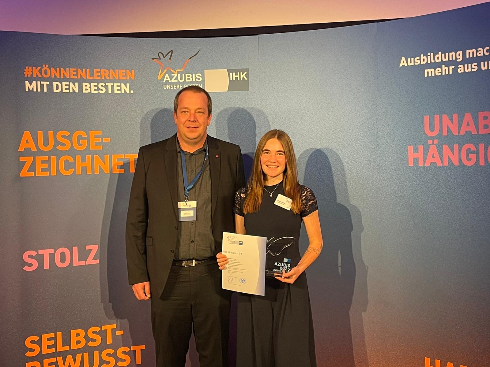 17.12.2025 Herzlichen Glückwunsch – Auszeichnung als Bundes- und Landesbeste Unsere Auszubildende Jennifer Lodziato erhielt die Auszeichnung als Bundes- und Landesbeste. Auszeichnung als Bundes- und Landesbeste Wir sind sehr stolz auf unsere Auszubildende Jennifer Lodziato, die im Rahmen der diesjährigen Bestenehrung gleich zwei Erfolge feiern durfte: Sie wurde sowohl als Landesbeste in Baden-Württemberg als auch als Bundesbeste ausgezeichnet! Bestenehrung in Berlin Jennifer hat ihre Ausbildung zur Anlagemechanikerin an unserem Standort Bad Waldsee sehr gut abgeschlossen. Gemeinsam mit ihrem Ausbilder Martin Hopp nahm sie an der offiziellen Ehrung in Berlin teil. Ausbilder Martin Hopp „Die Ehrung war ein ganz besonderes Erlebnis. Ich bin stolz auf Jennifer, habe ihr zu dem großartigen Erfolg gratuliert und freue mich sehr darauf, sie als Fachkraft in unserem ThügaNETZE Team zu haben“, sagt Ausbilder Martin Hopp, der seine Kollegin zur Bundesbesteneherung nach Berlin begleiten durfte. Bildnachweise: DIHK / Jens Schicke / Christian Plambeck